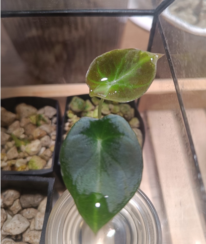 Und sie war auch nicht alleine: ich hatte Rhizome im Topf gefunden. Alle natürlich dann eingepflanzt. Eins war sogar bewurzelt. Und so hat ein Black Velvet-Baby heute bei mir sogar zwei Blätter. Ein anderes hat Blätter gebildet und sie wegen Wurzelfäule wieder abgeworfen. Und damit leben jetzt vier Blätter verteilt über eine Moosbox, mein Terrarrium, mein Mini-Gewächshaus und einen Topf mit Semihydro. Na das ist ja mal jämmerlich.
