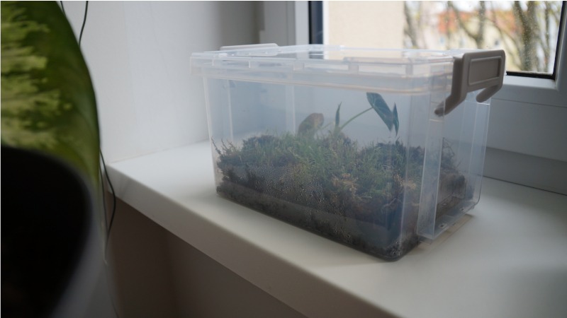 Das Gewächshaus war die Hauptmethode für Alocasia und für Dieffenbachia machte ich immer Stecklinge in Erde. Aber das geht deutlich besser: weniger Bakterien und stabilere Bedingungen in der Moosbox. Innerhalb weniger Wochen treiben gesunde und frische Dieffenbachia- Stücke wieder aus und in einer geschlossenen Box funktioniert das besonders gut.